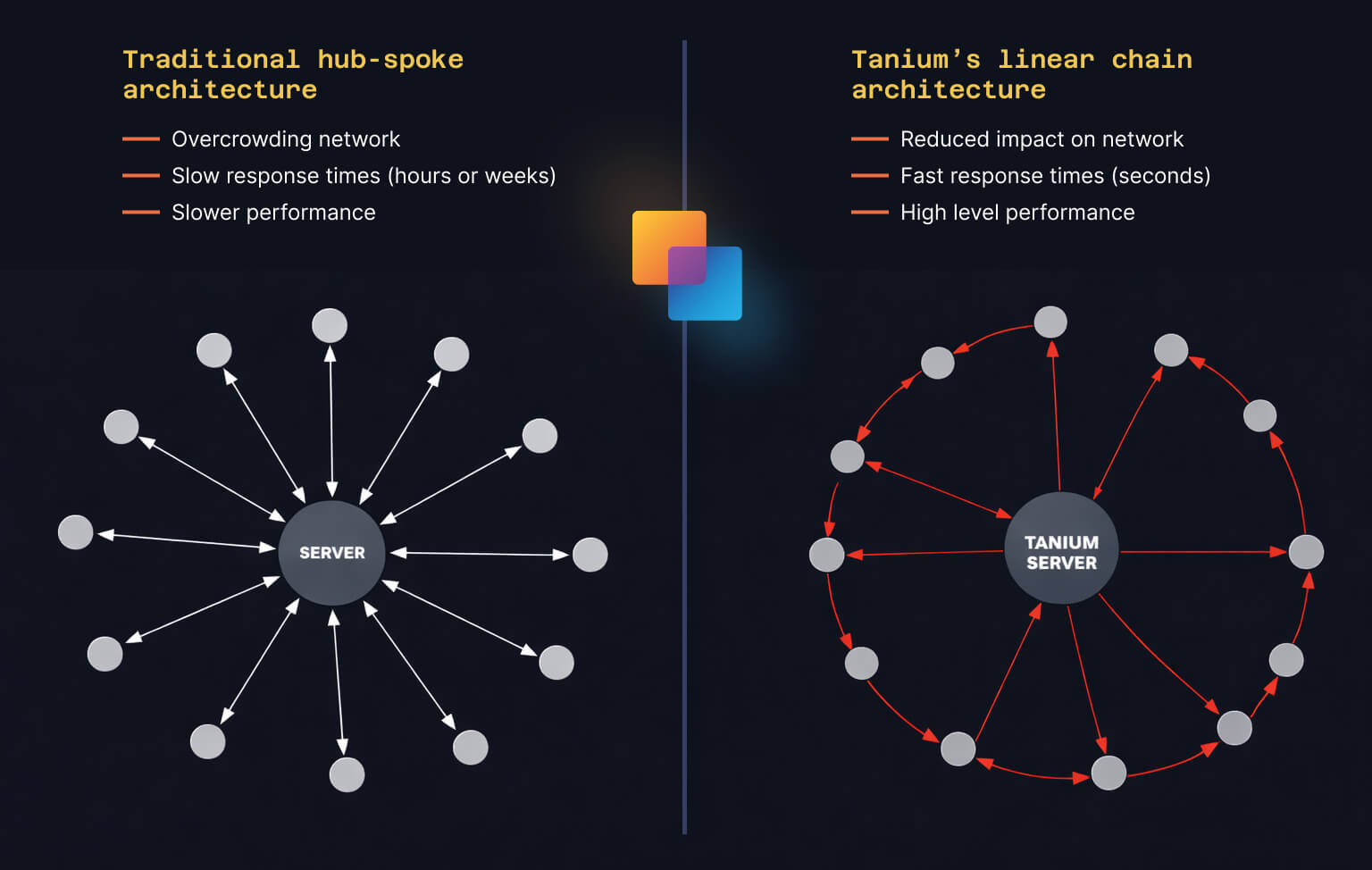 Tanium is an endpoint management and security platform designed to give IT operations and security teams comprehensive, real-time endpoint visibility, instant data collection measured in seconds rather than hours or days, fast patching and configuration changes, and effective threat detection and response. Tanium also enables unified operations and security workflows. What makes Tanium unique is how it gathers data and issues instructions across endpoints. Instead of relying on heavy servers or expensive infrastructure, Tanium uses a linear peer-to-peer (P2P) communication model that scales extremely efficiently across large and distributed environments.